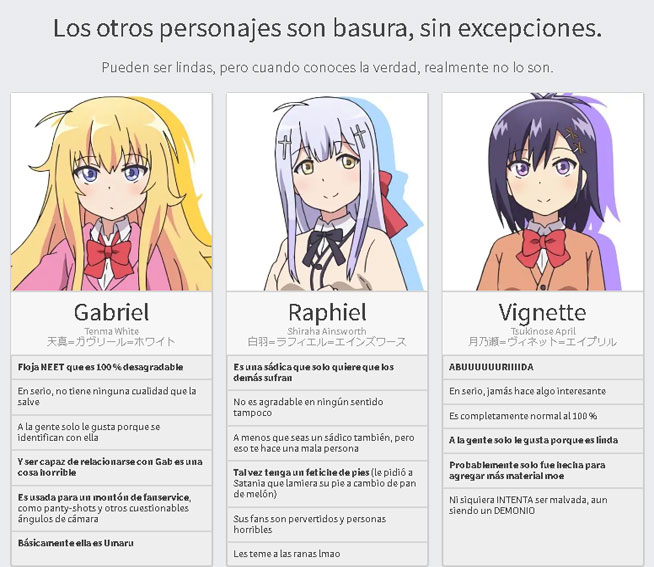 Sin embargo, una persona creo un sitio web endiosando y explicando el por que Satania del anime Gabriel Dropout es «La mejor waifu de todas», colocandola por encima de las demás personajes de su anime.