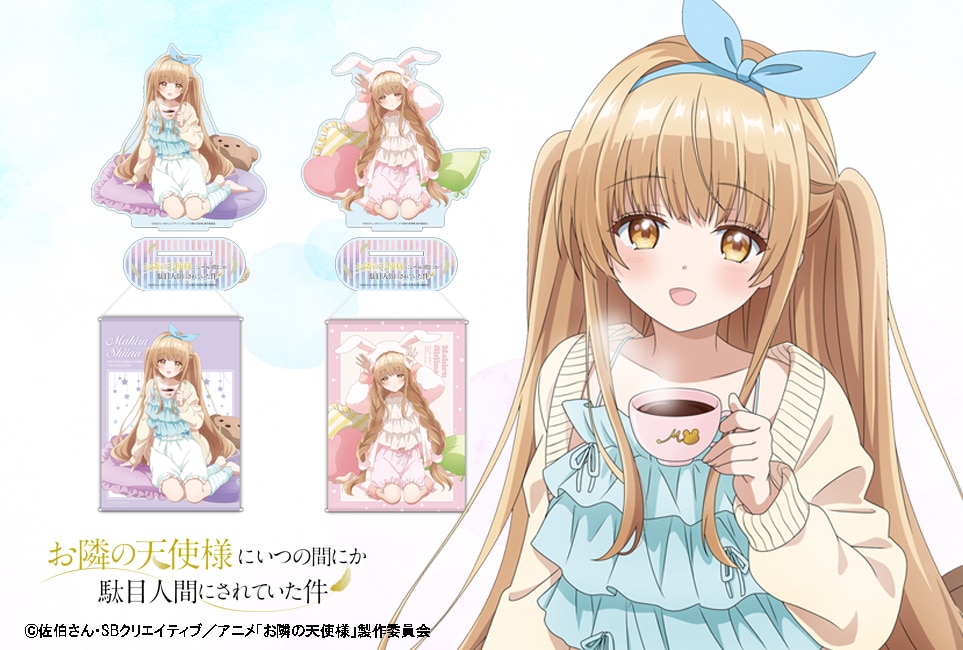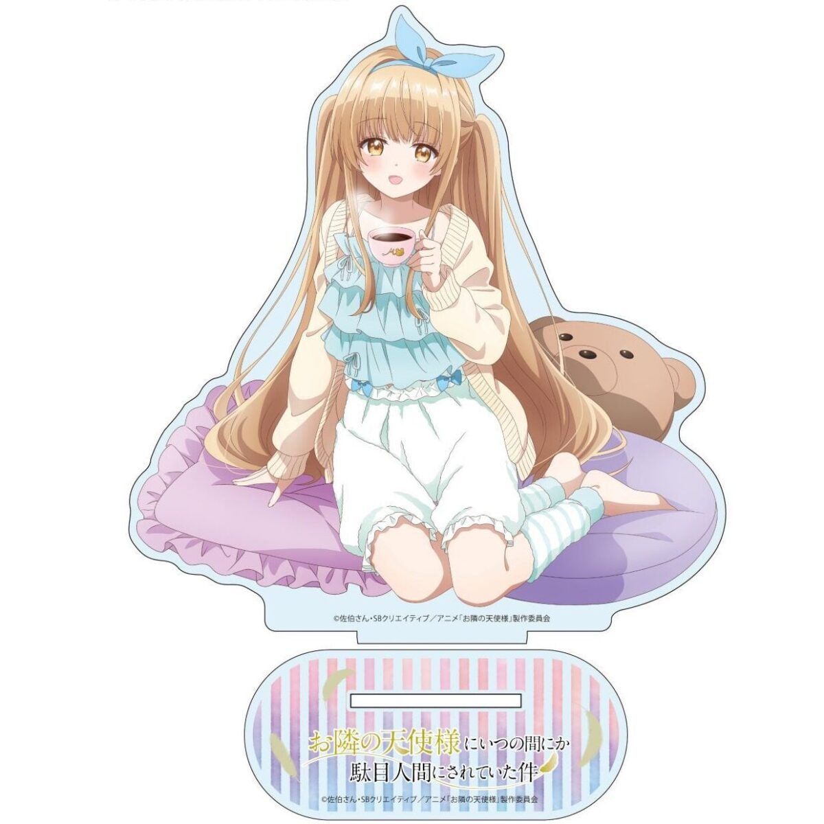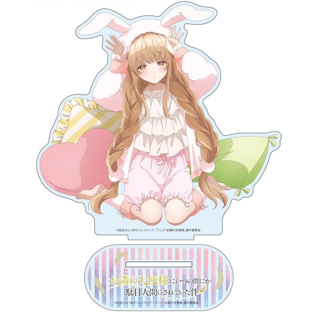 En esta mercancía podemos apreciar como Mahiru de Otonari no Tenshi-sama se roba el protagonismo en esta nueva línea de productos en donde podemos aprecias figuras de soporte de acrílico con impresión a chorro de tinta de 15 cm de longitud cuyo precio será de 5000 Yenes (36 Dólares) que nos muestran la faceta más tierna de la protagonista, la cual pareciera estar lista para disfrutar de una encantadora pijamada.