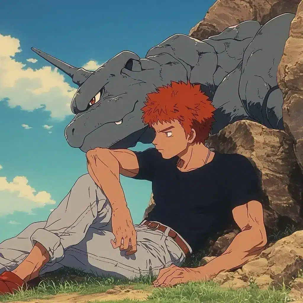 Luego observamos a un fuerte Onix acompañado de su entrenador Brock, apoyado en unas rocas. Su peculiar diseño ha impactado a muchos, pues en esta versión tiene un cambio radical, haciéndolo parecer un poco más serio y menos infantil, con un cambio de expresión y con los ojos abiertos, además del cabello rojizo. Y por supuesto, no podían faltar los Pokémon más representativos de la primera generación.