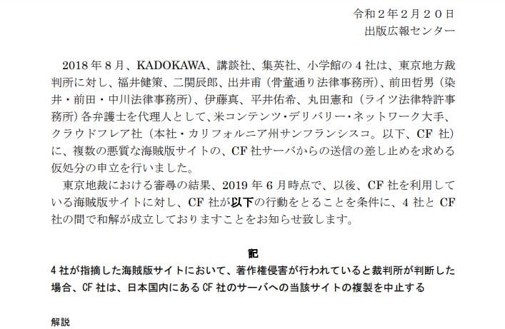 El portal Shuppan Kouhou Center anunció que las editoriales japonesas Kadokawa, Kodansha, Shueisha y Shogakukan llegaron a un acuerdo con la compañía de seguridad web estadounidense Cloudflare en junio de 2019.