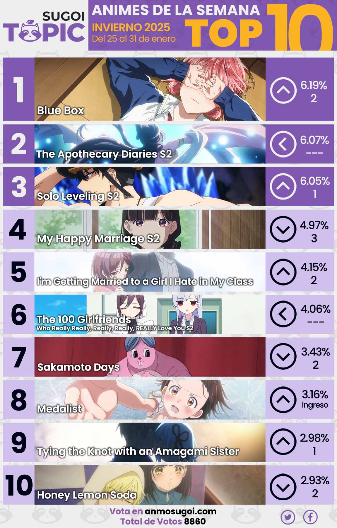 El anime BLUE BOX se ubica en la primera posición, seguido de THE APOTHECARY DIARIES S2 y SOLO LEVELING S2.