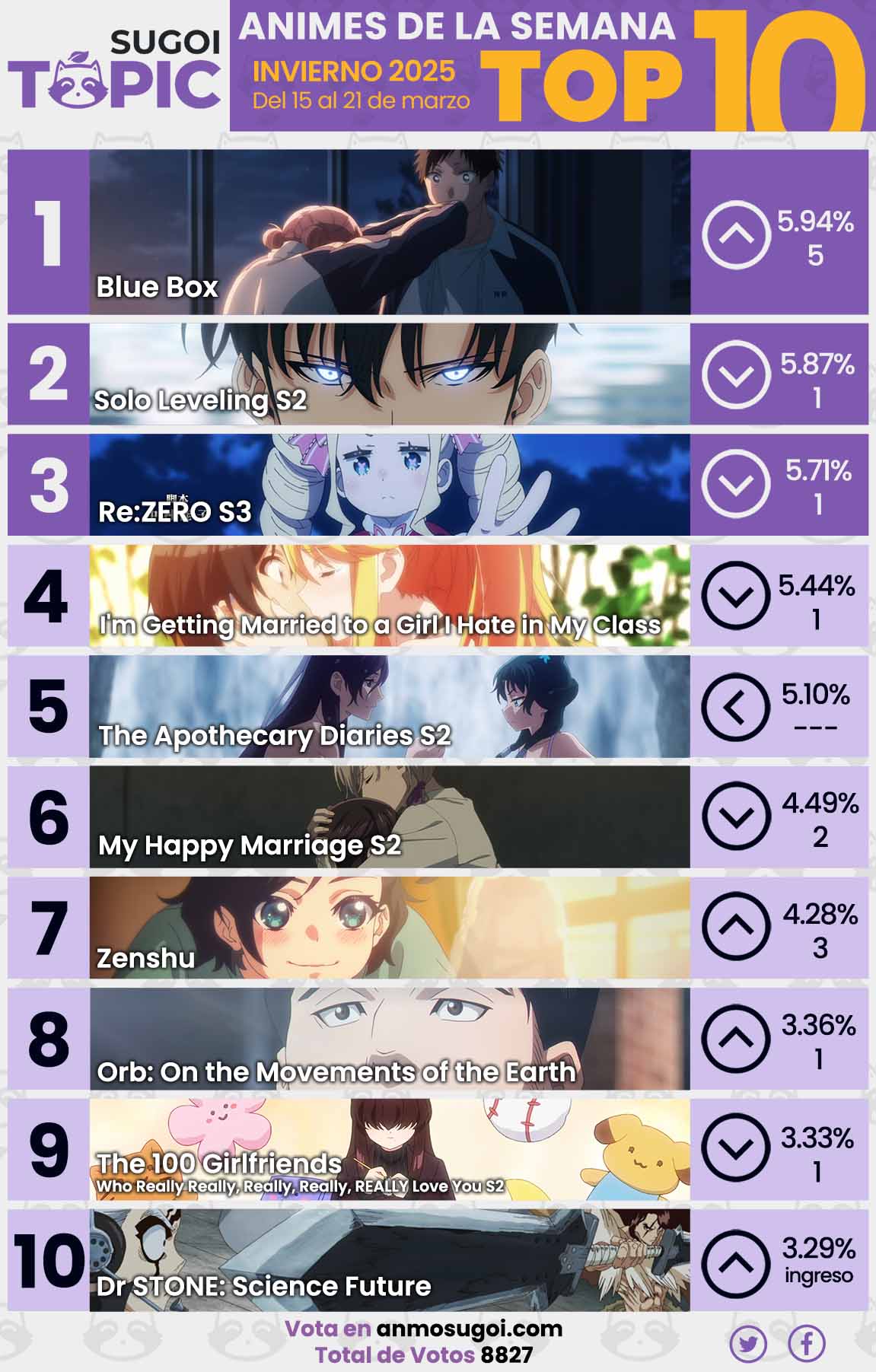 La encuesta semanal de nuestro decimo Anime Ranking de la temporada de invierno 2025, está cerrada!, con un total de 8827 votos emitidos por todos los fans del anime, compilamos esta lista de los animes favoritos estrenados durante la decima semana de esta temporada.