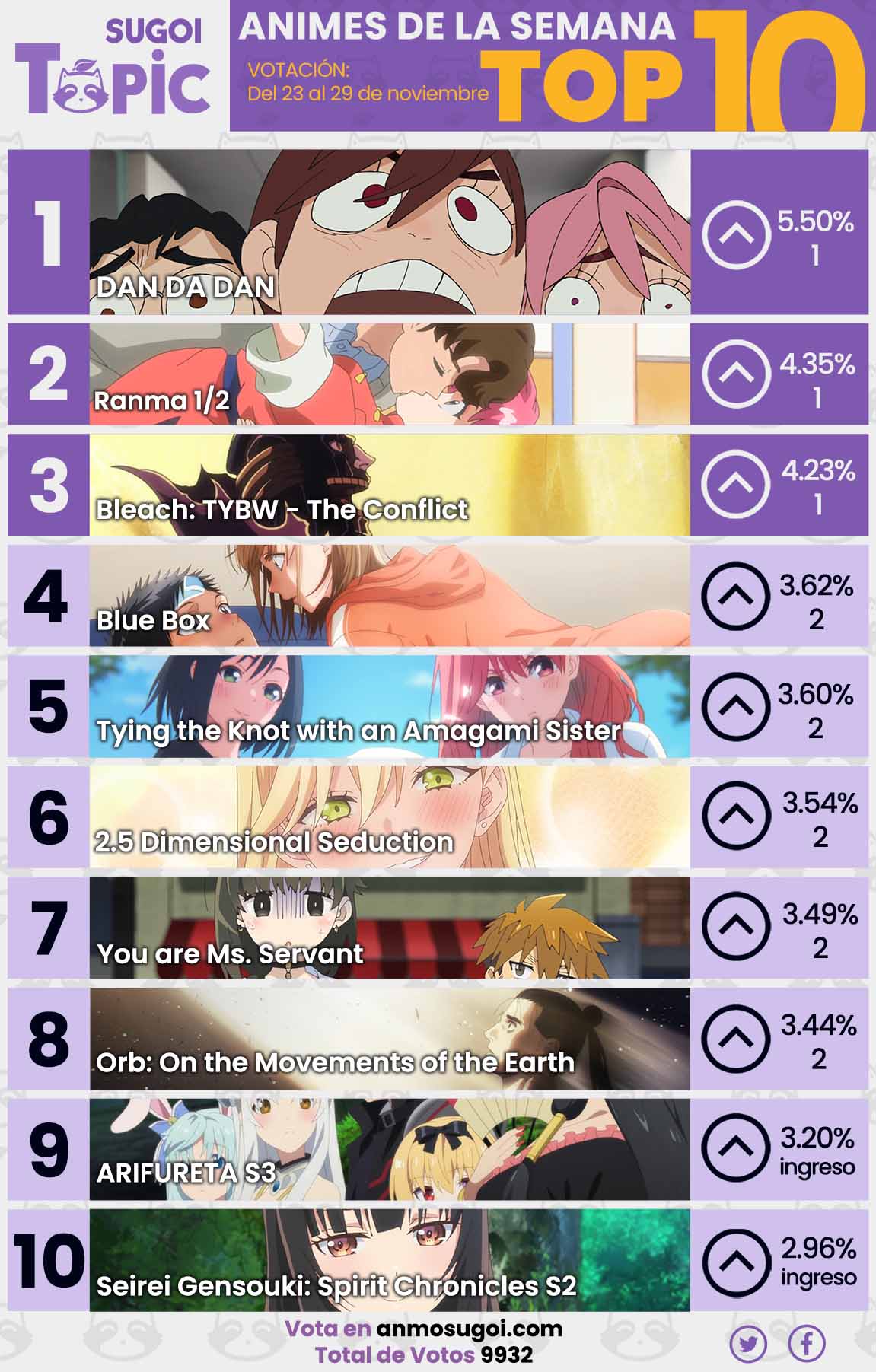 El anime DANDADAN se ubica en la primera posición del ranking, seguido de Ranma 1/2 y Bleach: Thousand-Year Blood War – The Conflict.