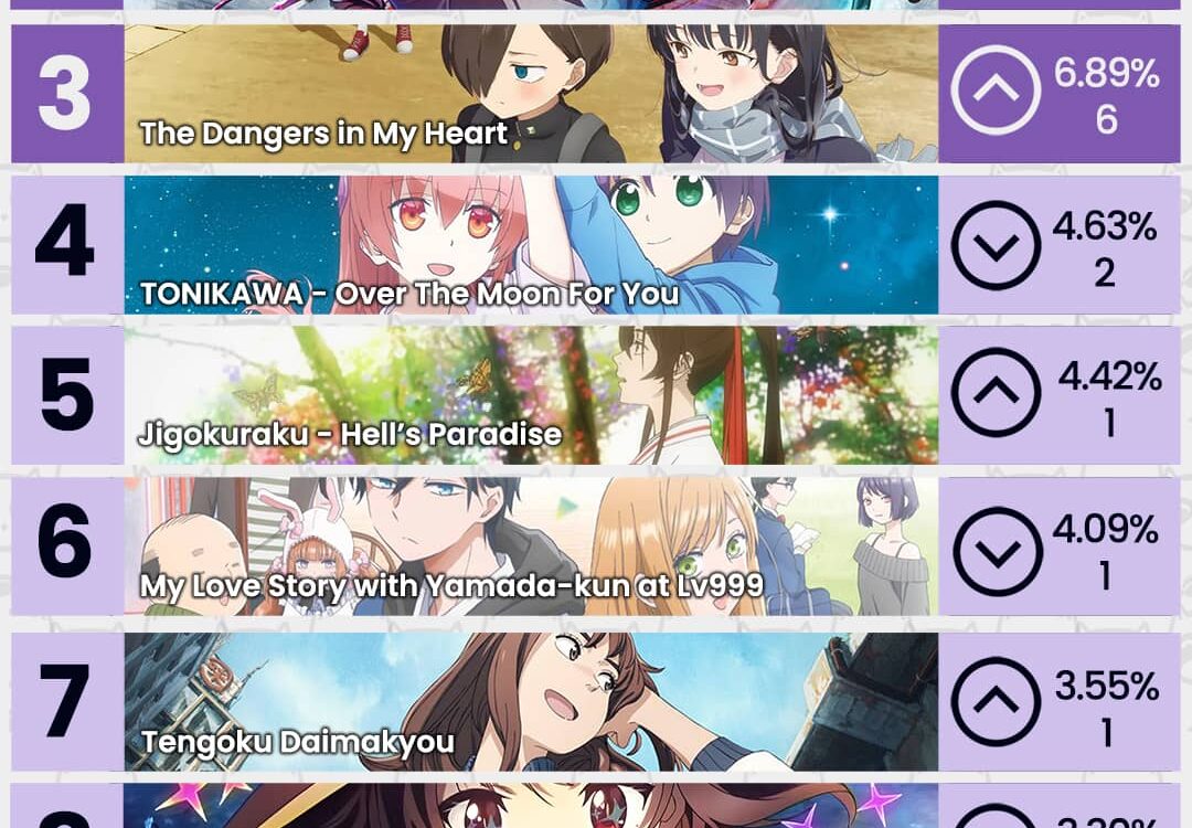 Los animes Oshi no Ko, Kimetsu no Yaiba Swordsmith Village Arc y The Dangers in My Hearth se ubican en el podio esta semana.
