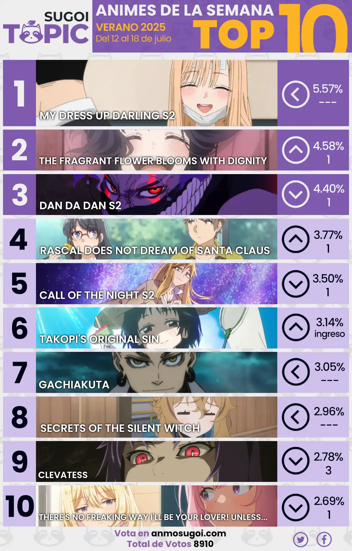 La encuesta semanal de nuestro segundo Anime Ranking de la temporada de verano 2025, está cerrada!, con un total de 8910 votos emitidos por todos los fans del anime, compilamos esta lista de los animes favoritos del público latino estrenados durante la segunda semana de esta temporada.