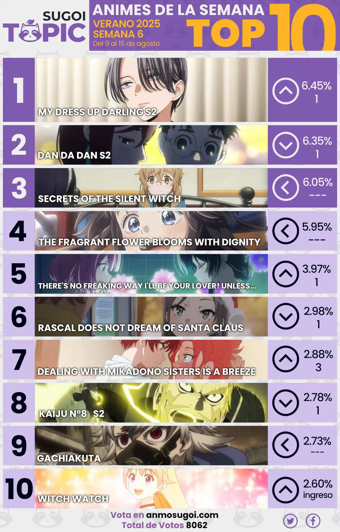 La encuesta semanal de nuestro sexto Anime Ranking de la temporada de verano 2025, está cerrada!, con un total de 8062 votos emitidos por todos los fans del anime, compilamos esta lista de los animes favoritos del público latino estrenados durante la sexta semana de esta temporada.