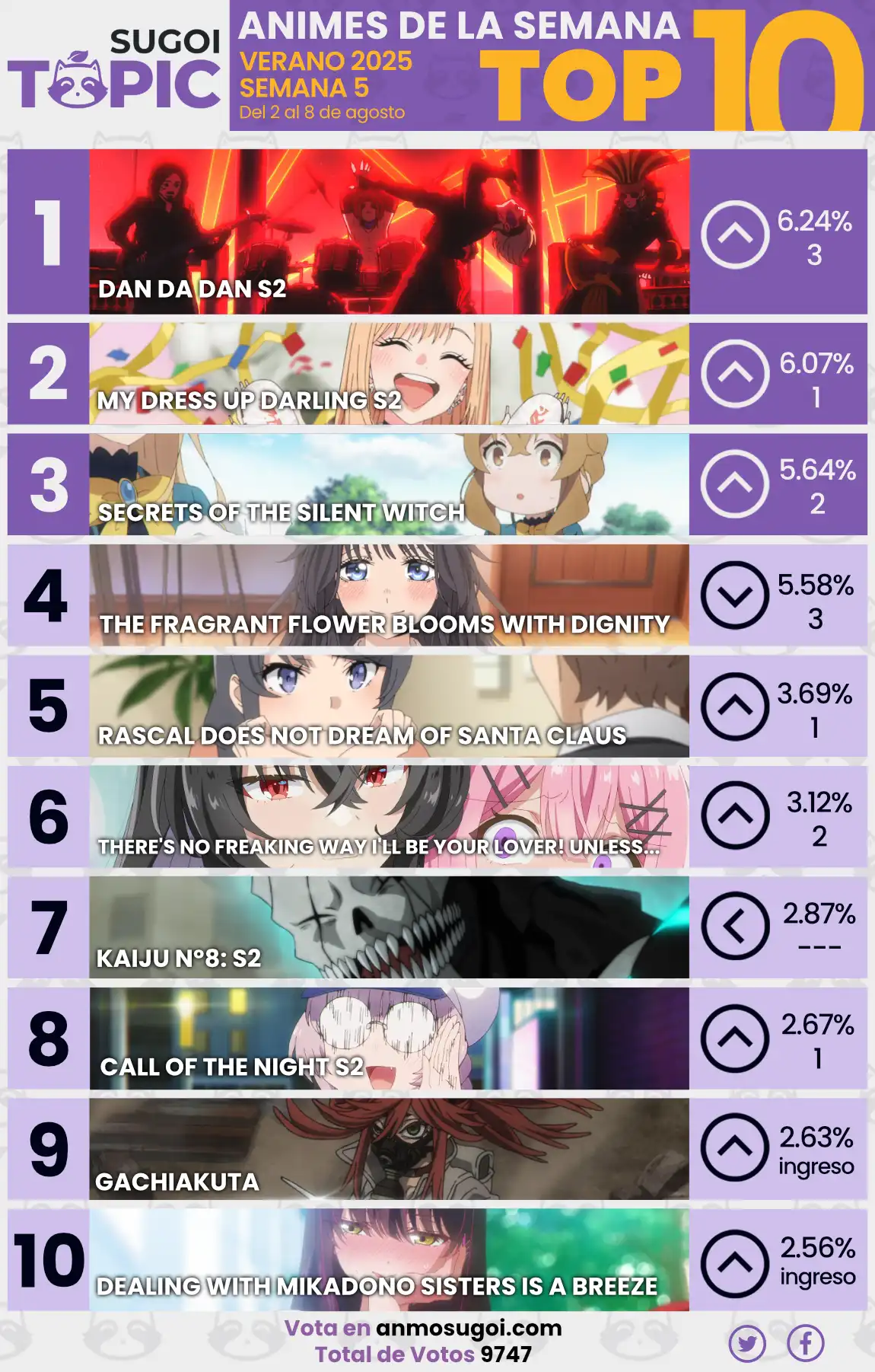 La encuesta semanal de nuestro quinto Anime Ranking de la temporada de verano 2025, está cerrada!, con un total de 9747 votos emitidos por todos los fans del anime, compilamos esta lista de los animes favoritos del público latino estrenados durante la quinta semana de esta temporada.