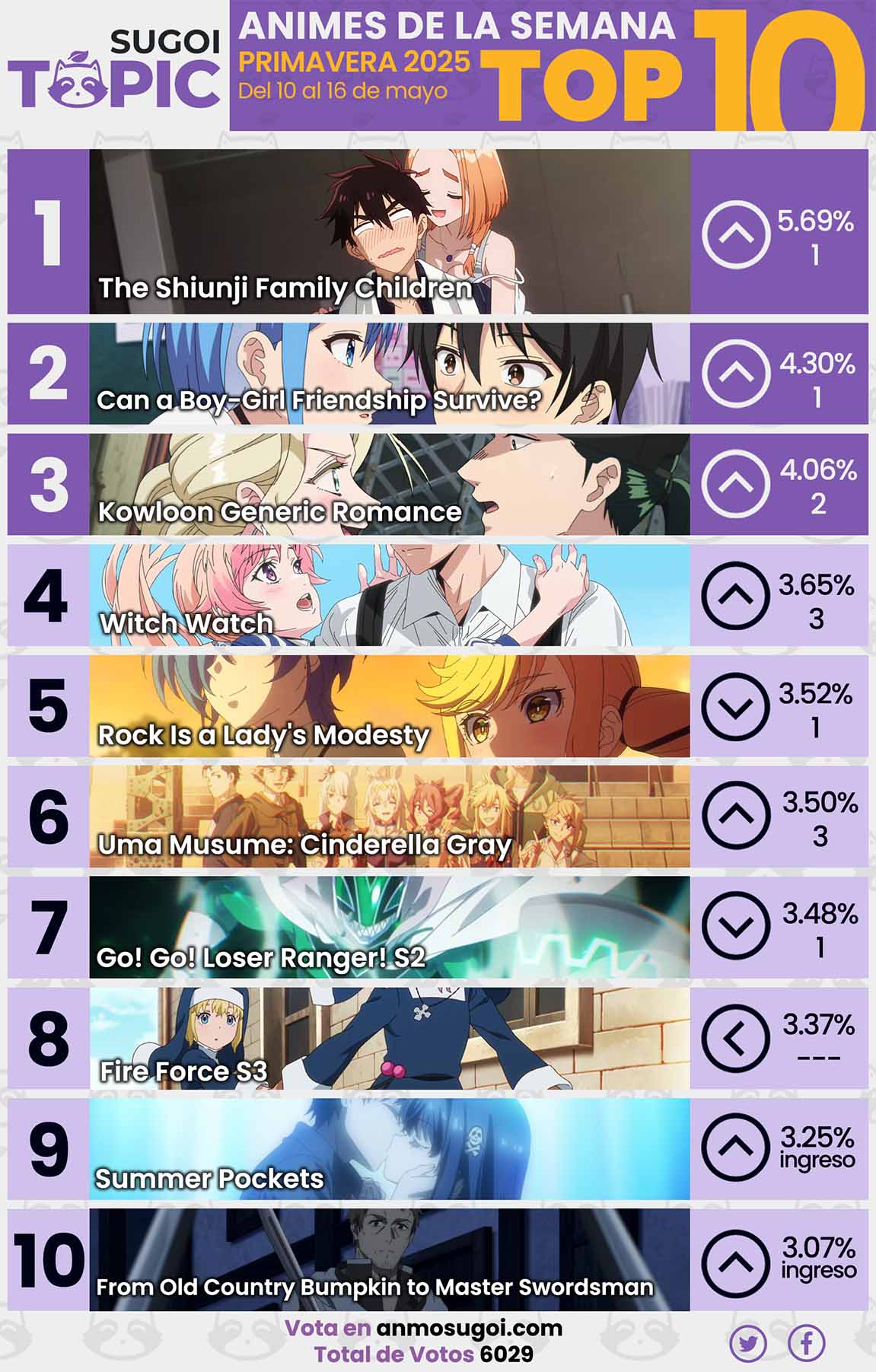 La encuesta semanal de nuestro sexto Anime Ranking Latino de la temporada de primavera 2025, está cerrada!, con un total de 6029 votos emitidos por todos los fans del anime, compilamos esta lista de los animes favoritos del público hispano estrenados durante la sexta semana de esta temporada.