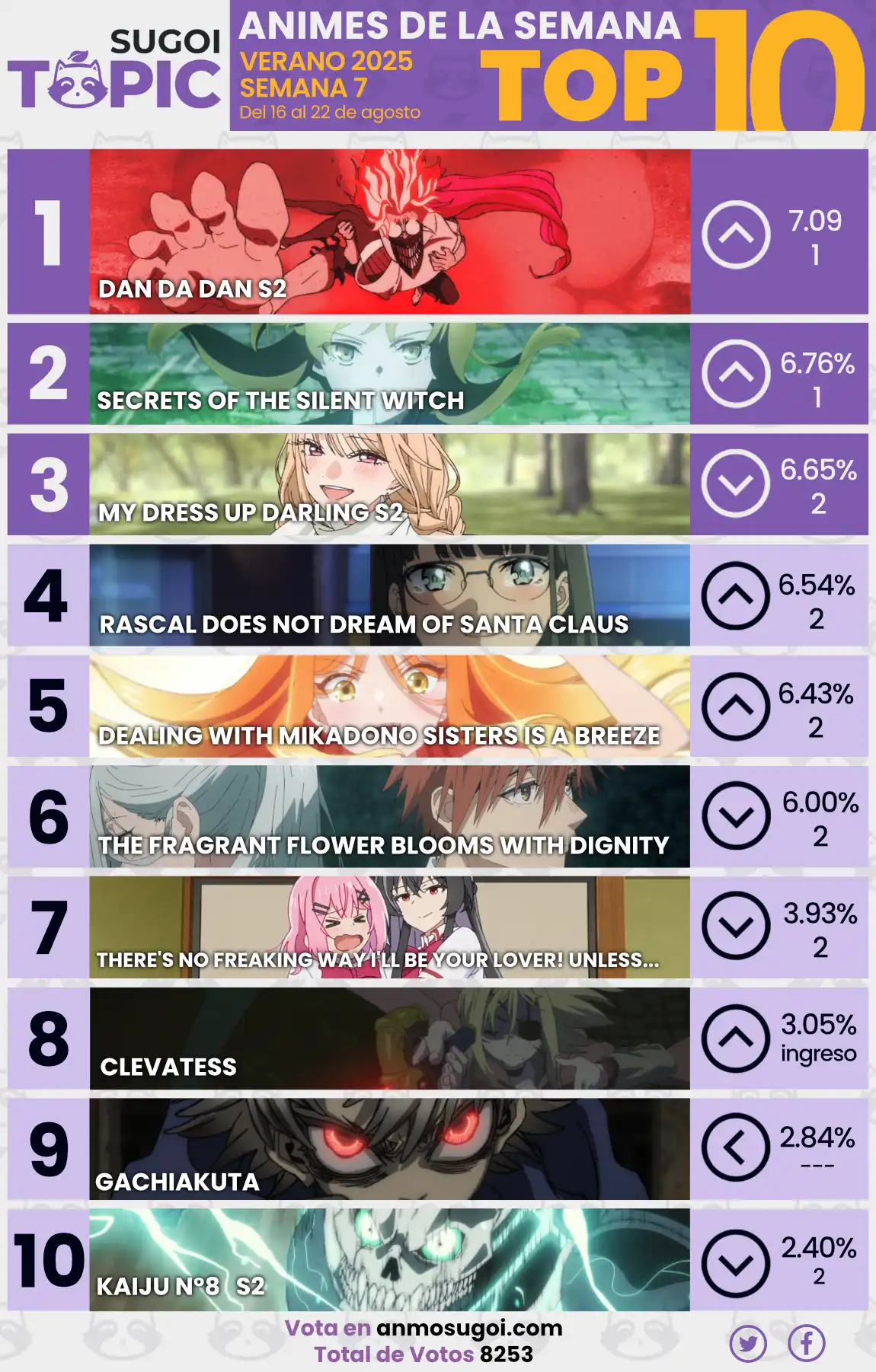 La encuesta semanal de nuestro sรฉptimo Anime Ranking de la temporada de verano 2025, estรก cerrada!, con un total de 8253 votos emitidos por todos los fans del anime, compilamos esta lista de los animes favoritos del pรบblico latino estrenados durante la sรฉptima semana de esta temporada.