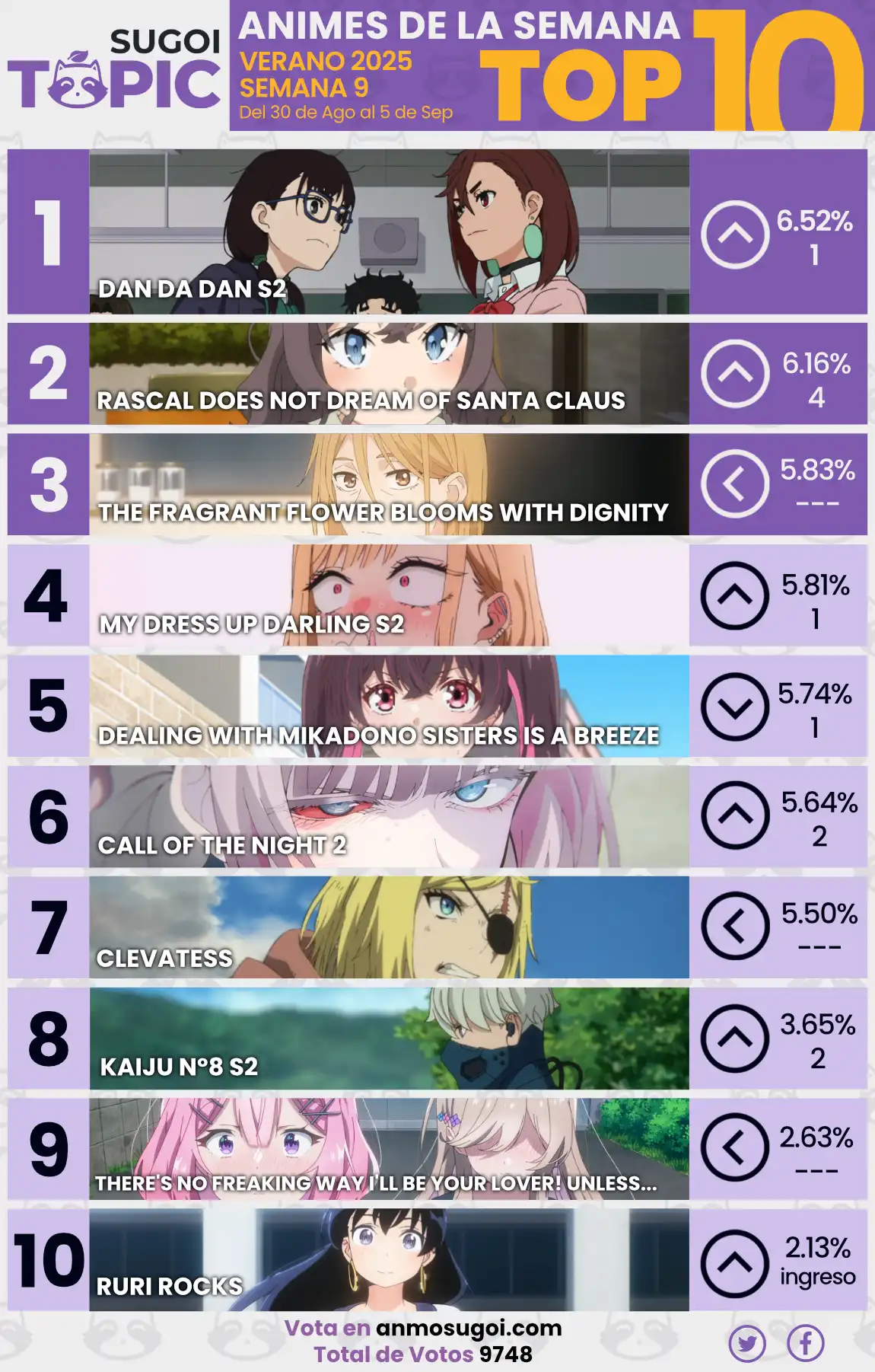 Además, te recomendamos seguir a Sugoi Topic en Facebook y Twitter para estar al pendiente de los nuevos estrenos y las publicaciones de nuestras votaciones.