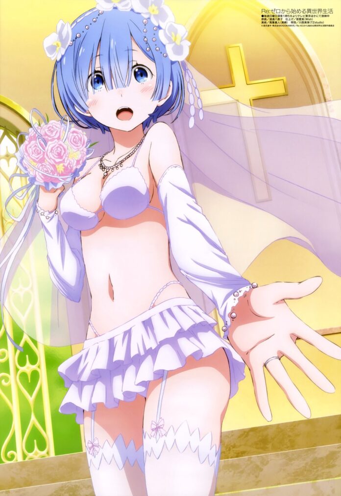 La ilustración de la tarjeta inspirada en Rem nos muestra a la protagonista en un vestido que mezcla el tradicional vestido de novia con un atrevido conjunto de lencería.