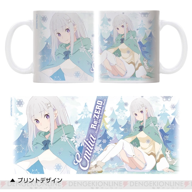 Una taza de cerámica con una ilustración de Emilia que se inspirada en la más reciente OVA de la franquicia por 1,650 yenes.