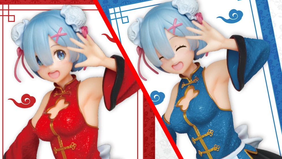Las figuras nos muestran a Rem vistiendo un tradicional vestido chino que mezclan el concepto de maids y están disponibles en dos variantes de colores; una de color azul y otra de color rojo. Las figuras estarán disponibles a partir de finales de agosto.