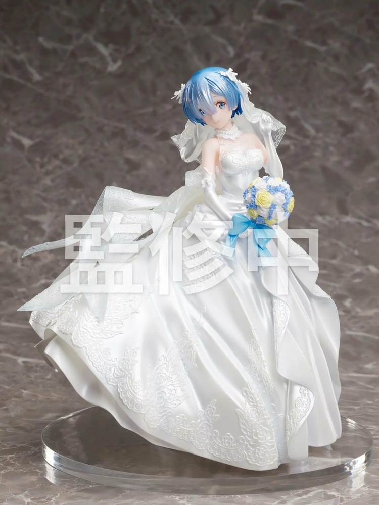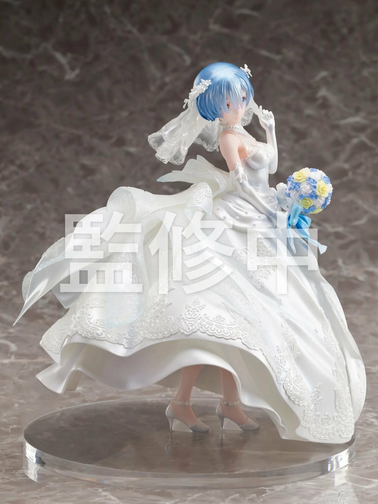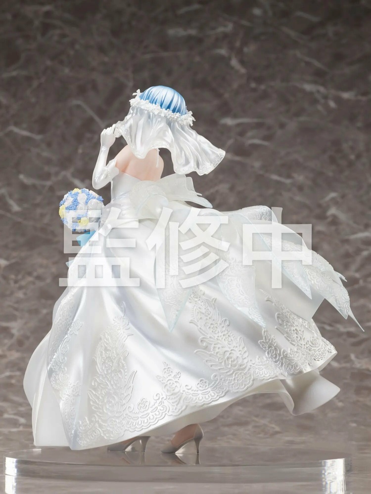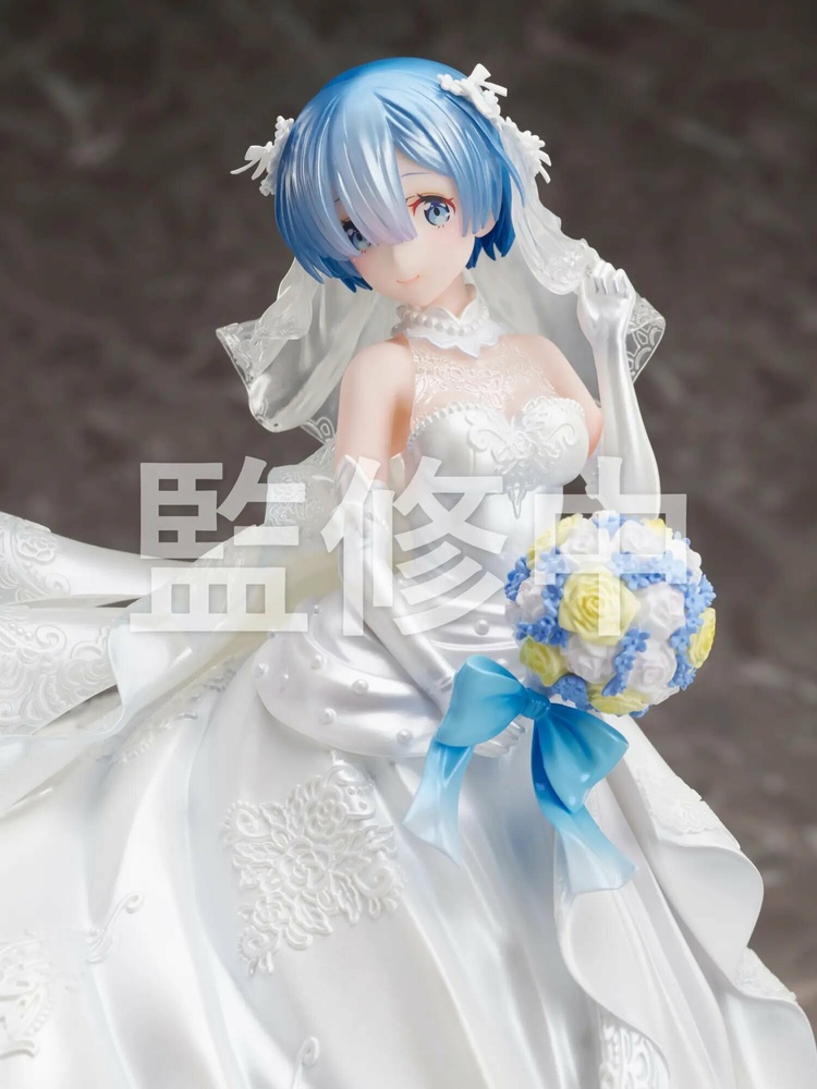 La figura nos muestra al personaje Rem portando un hermoso vestido de novias de color blanco. Dejando a la vista sus hermosos ojos y llevando un ramo de flores con un moño azul, los detalles en la vestimenta, los tacones y los delicados guantes, dan mucho de que hablar con respecto a la dedicación en cada uno de estos. Sin duda alguna, es el sueño de varios fanáticos del personaje verla utilizar este vestido