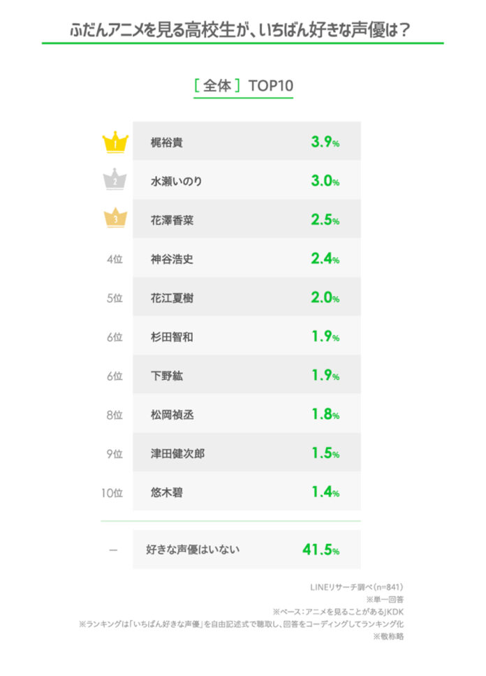 Mediante una encuesta realizada por la aplicación de mensajería Line a 841 estudiantes japoneses (428 hombres y 413 mujeres) que ven anime de manera regular, se registró que apenas el 60% de ellos tiene al menos un seiyuu, actor de voz favorito. Entre estos, la respuesta más común tanto para hombres como para mujeres fue que tenían 2 o 3 seiyuus favoritos.
