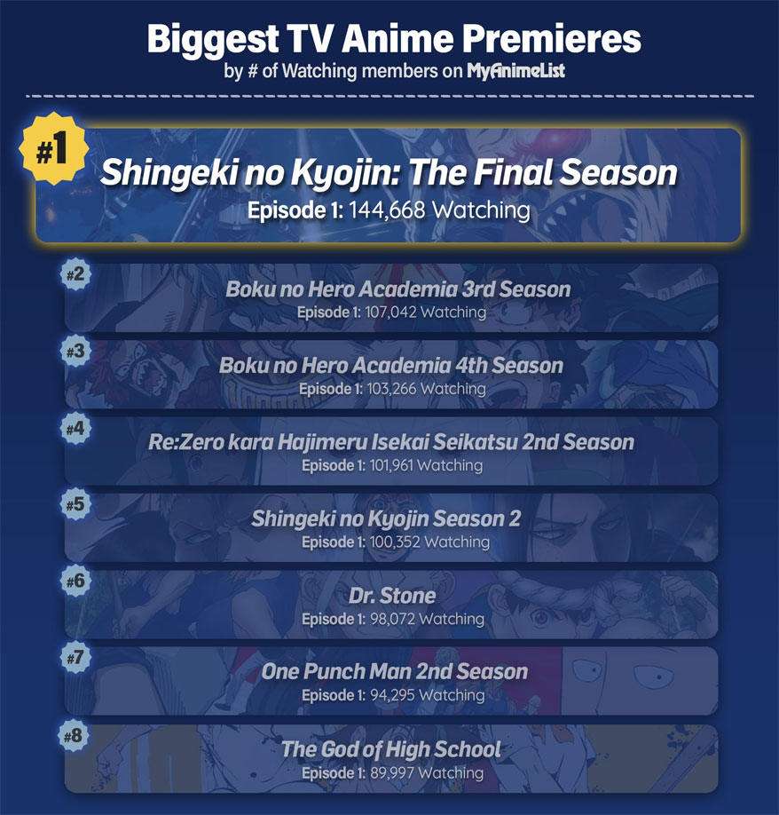 Ya hemos visto como el sitio web de Crunchyroll no pudo aguantar la cantidad inmensa de personas que querían ver el estreno, y ahora según los usuarios registrados de My Anime List (MAL), el estreno de Shingeki no Kyojin The Final Season es el debut mas visto del sitio web con un total de 144,668 espectadores.
