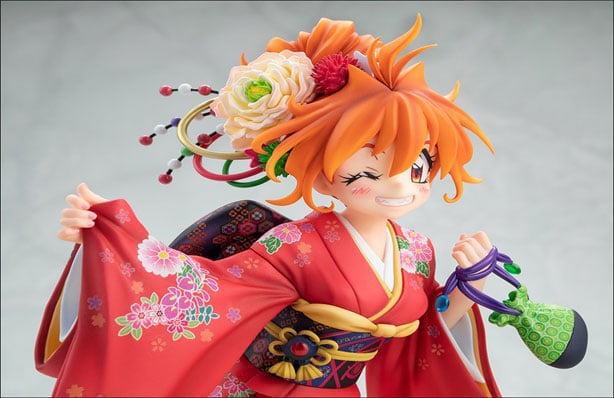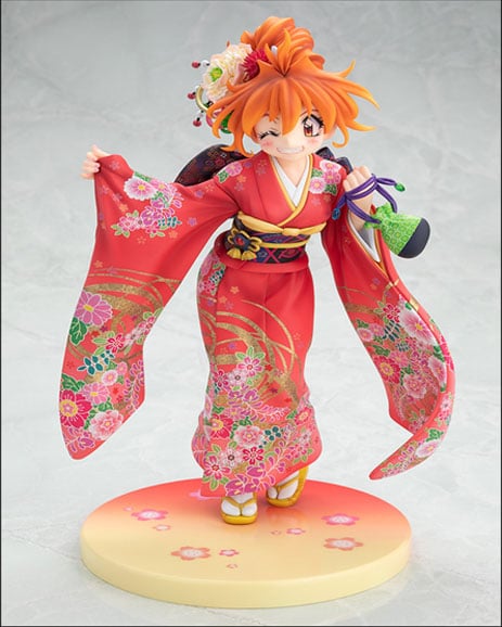 La figura nos presenta a la heroina Lina Inverse en un kimono floral con un postizo adornado a juego, logrando resaltar la belleza de la figura y lo elegante que se ve. Dicho producto está basada en una ilustración de celebración de la artista Rui Araizumi