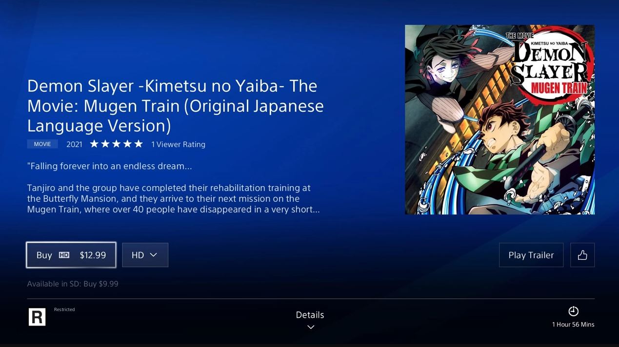 En la últimas horas, usuarios de Reddit y Twitter se percataron que la película Kimetsu no Yaiba: Mugen Ressha-Hen podía adquirirse por 12,99 dólares en la tienda online de PlayStation en Estados Unidos. La película podía verse en inglés y japonés, a pesar de que sólo se estrenó en los cines de Estados Unidos el pasado viernes.