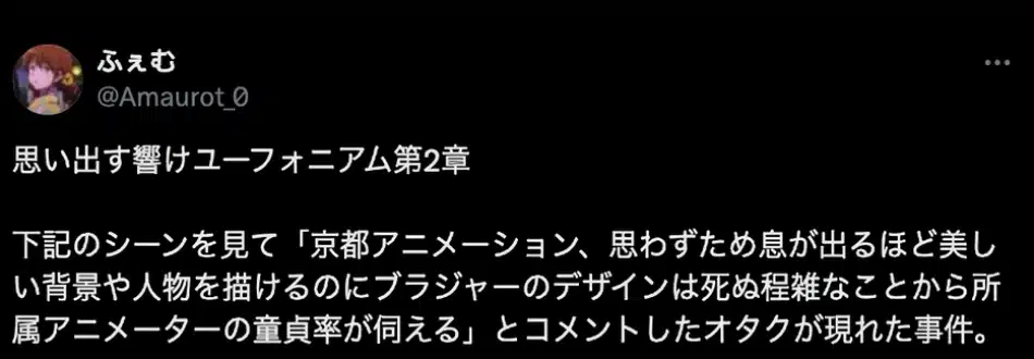 Más concretamente este particular fan dijo que Kyoto Animation tenía la habilidad de dibujar fondos y personajes increíblemente hermosos, pero el diseño de los sujetadores era tan malo, carente de atractivo y sensualidad que se puede notar el índice de poca experiencia y contacto con las mujeres de los animadores con los que trabajan en el proyecto. Evidentemente, este comentario causó mucho revuelo en aquel momento entre los fans del anime y hoy qué su tercera temporada se encuentra en emisión, aún hay muchos que recuerdan este incidente e incluso hay quienes apenas se van enterando de que esto pasó.