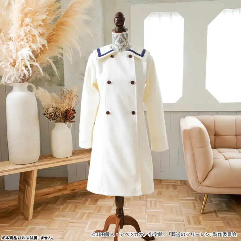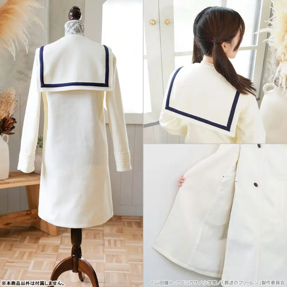 El abrigo está confeccionado con un diseño de doble botonadura, con un corte favorecedor en forma de A, además, cuenta con un cuello tipo sailor confeccionado con el mismo material, lo que le da un acabado lujoso, para garantizar comodidad y protección contra el frío. Esta prenda está hecha de un tejido grueso con forro y doble abotonadura que mejora la retención de calor, el diseño se inspira directamente en la vestimenta de Frieren en el anime, logrando un equilibrio entre fidelidad a la obra original y funcionalidad para el uso diario.
