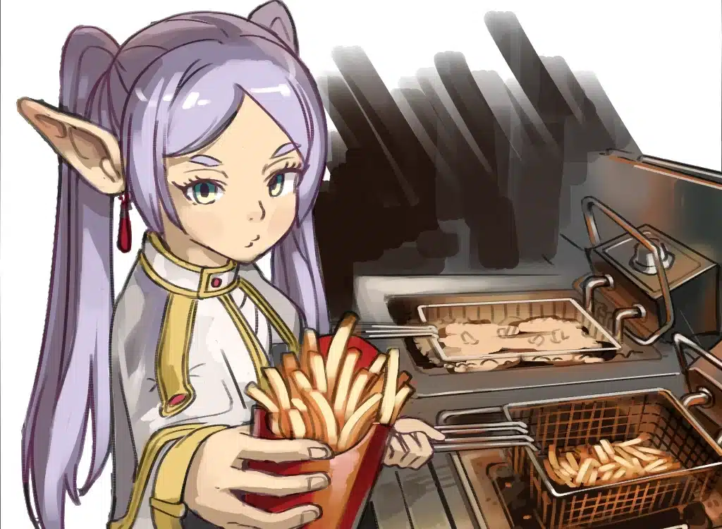 Mostrรกndonos esta imagen y viendo como son Frieren y Fern no es tan difรญcil imaginarnos que este par de personajes trabajen en un establecimiento de comida rรกpida como McDonalds para pagar alguna deuda que tengan o para juntar dinero para algo que necesitara Frieren, pero sin duda el tratar de imaginarnos la interacciรณn que tendrรญan ellas trabajando juntas ahรญ nos hace reรญr y pensar que habrรญa muchas situaciones memorables de ellas dos trabajando que harian de este ambiente de trabajo uno muy divertido.