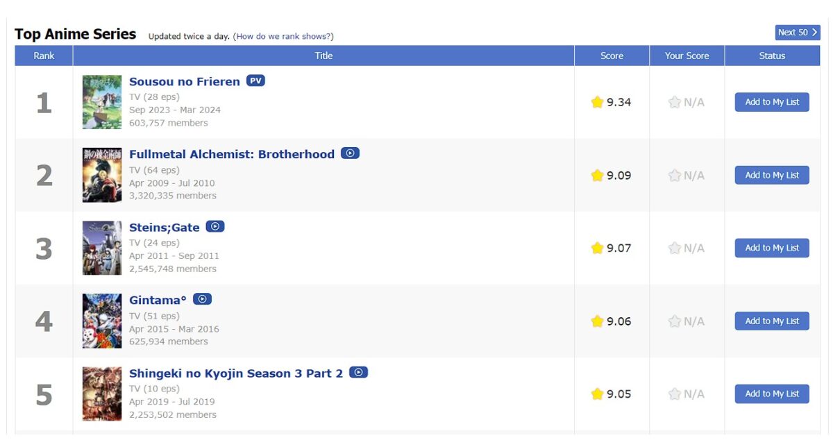 Sin embargo, algo que llamó la atención para los japoneses que son fans del anime, es la velocidad con la que Sousou no Frieren obtuvo esta posición en la lista de popularidad en MyAnimeList, esto debido a que con solo una temporada emitida, consiguió superar a franquicias muy queridas y bien reconocidas dentro de la comunidad como lo son Hunter x Hunter, Shingeki no Kyojin, Gintama y Fullmetal Alchemist. Especialmente causó sorpresa que pudiera encontrarse por encima de este último mencionado, y así lo expresaron comentando que era asombroso lo que Sousou no Frieren había sobrepasado a otra de las historias más aclamadas.