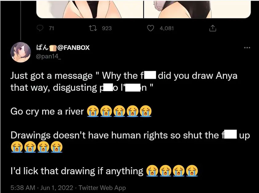 Acabo de recibir un mensaje de texto: ‘¿Por qué diablos dibujaste a Anya así, repugnante lolicon pedo?’.