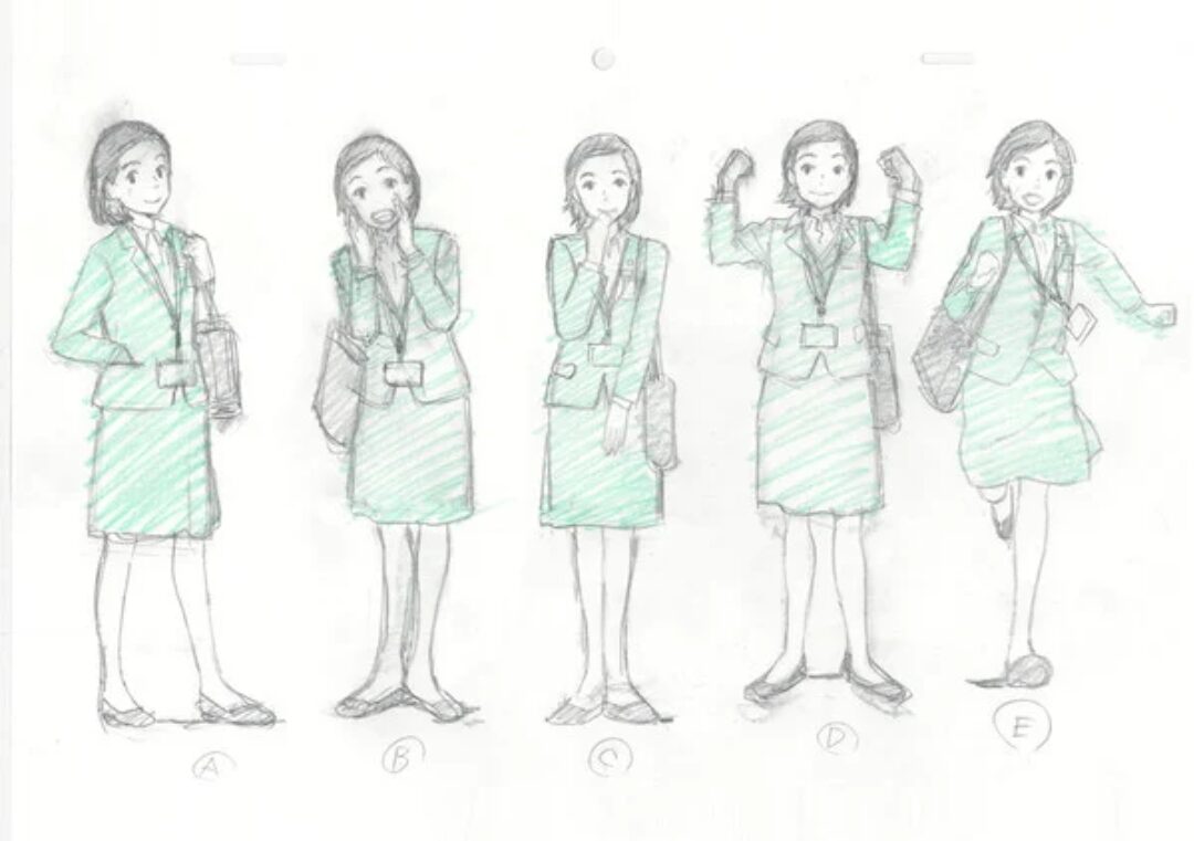 Por cierto, la señora de la oficina ahora tiene un nombre: Aki. Ella es interpretada por la actriz Kanon Nanaki (Danganronpa: Kibou no Gakuen). Su personaje está diseñado por Hiroyuki Aoyama (Toki wo Kakeru Shōjo, Summer Wars, directora de animación de Mirai), quien también se desempeñó como directora de animación en el anuncio. El sitio web especial para el anuncio publicó los bocetos de diseño de personajes de Aoyama, que se muestran a continuación:
