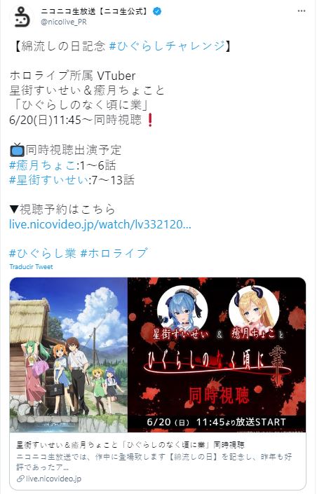Mediante la cuenta del usuario de Twitter Nicolive, se anunció que las VTubers Suisei Hoshimachi y Yuzuki Choco verán el anime Higurashi durante una transmisión en vivo el próximo 20 de junio.