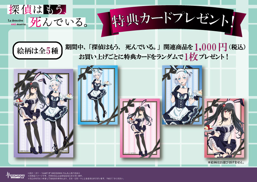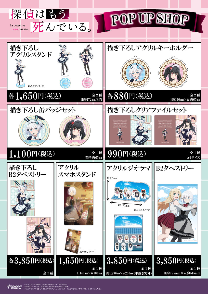 La colaboración entre la compañía Medicos Entertainment y el anime Tantei wa Mou, Shindeiru comenzará a partir del 21 de enero de 2022 hasta el próximo 6 de febrero del año 2022, y los productos de Siesta y Nagisa se exhibirán en la tienda «Medicos Shop«.