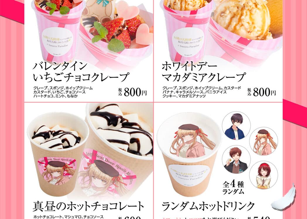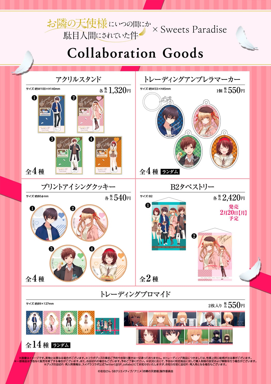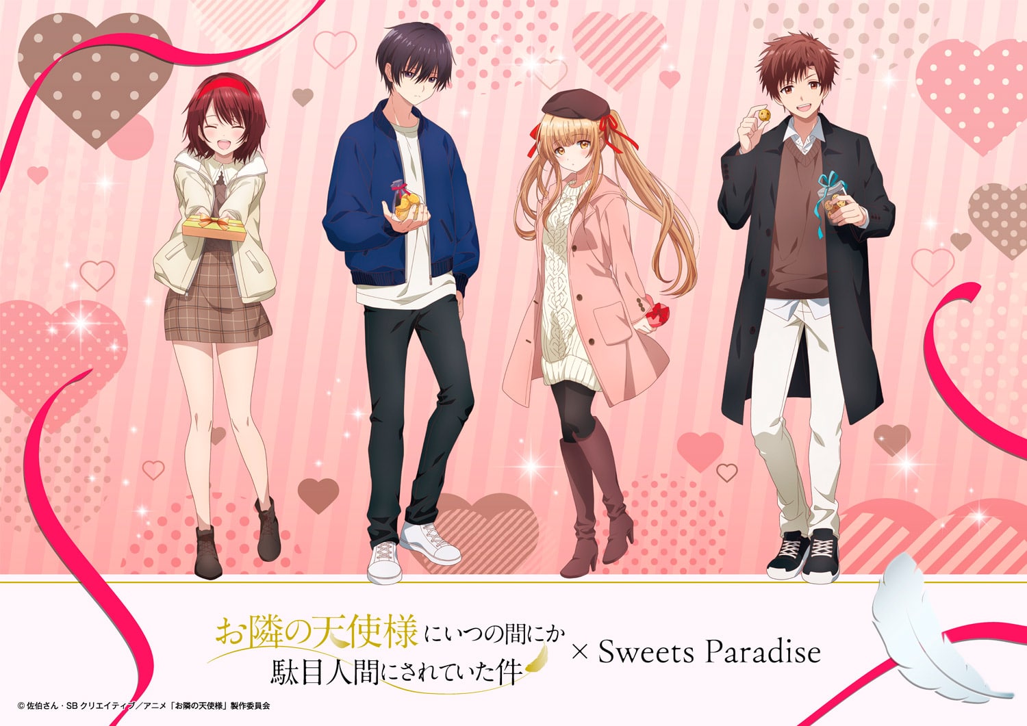 El anime «Otonari no Tenshi-sama ni Itsunomanika Dame Ningen ni Sareteita Ken» (The Angel Next Door Spoils Me Rotten) anunció una colaboración con la cafetería «Sweets Paradise» que consistirá en la elaboración de un menú especial y la producción de unos productos inspirados en los personajes Mahiru Shiina, Amane Fujimiya, Chitose Shirakawa y Itsuki Akazawa.