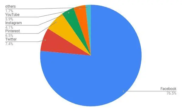 En este primer gráfico podemos observar la hegemonía que mantiene la red social de Mark Zuckerberg sobre las demás, con una aplastante cuota de mercado del 76.5% de los usuarios globales, seguida de Twitter con un 7.4%, estando en el tercer lugar del podio aparece Pinterest con un 6.5%. Un poco más atrás tenemos a Instagram con un 4.1% del mercado, seguida de YouTube con un 3.9% y el resto de otras redes representan un 1.7% del total de usuarios globales de redes sociales.