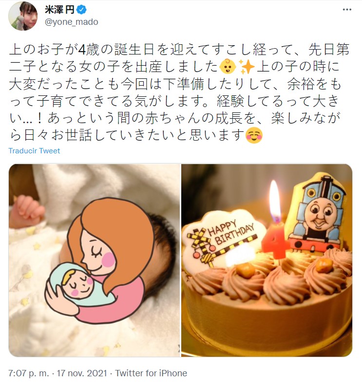 La actriz de voz Madoka Yonezawa (voz de Ui Hirasawa en K-ON!) anunció el nacimiento de su segundo bebe por medio de su cuenta de Twitter personal. En la publicación se especifica que su segundo hijo es una niña que goza de una excelente salud.