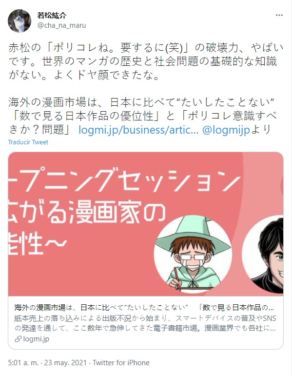 «En resumen, Akamatsu afirma que el poder destructivo de la corrección política, es malo. No tiene conocimientos básicos de la historia del mundo del manga ni de las cuestiones sociales. ¿Cómo puedes ser tan engreído?