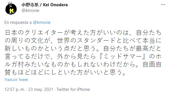 «Creo que lo que tienen que pensar los creadores japoneses es si la cultura que les rodea es realmente nueva en comparación con los estándares del resto del mundo. Que digamos que es lo mejor no quiere decir que para el mundo exterior no sea como el pueblo de Harga en pleno solsticio de verano*. Creo que es mejor ser moderado en los elogios.»