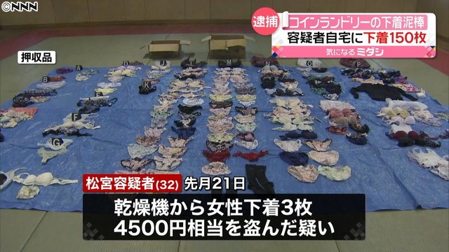 En Japón un hombre de 32 años llamado Shinya Matsmiya fue arrestado debido a acusaciones que lo involucran con el robo de ropa interior femenina y se le incauto en el momento de su detención un total de 150 pantsus. Originalmente, la policía de Mie arrestó al hombre desesperado bajo sospecha de robar tres piezas de ropa interior femenina el 21 de diciembre.