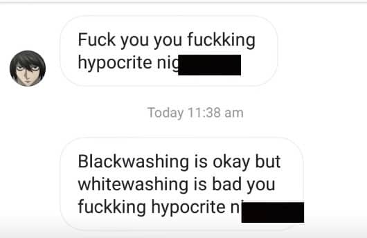 - «Jod**e tu maldi** neg** hipócrita. El blackwashing esta bien pero el whitewashing esta mal, tu maldi** neg** hipócrita».