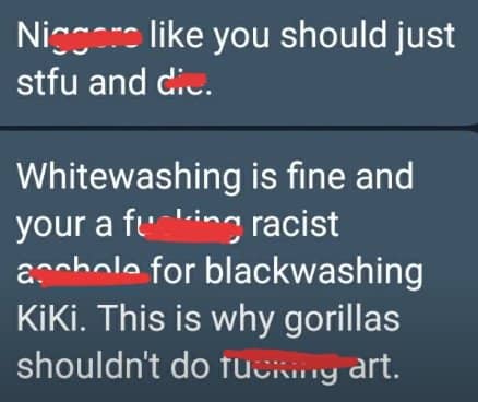 - «Neg** solo tienes que callarte y morir. El whitewashing está bien y tu eres una mald*** racista por hacerle blackwashing a Kiki. Este es el por qué los gorilas no deben hacer arte».