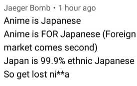 - «El Anime es Japones. El anime es PARA japoneses (El mercado extranjero ocupa el segundo lugar). Japón es 99.9% de etnia japonesa. Así que piérdete neg**».