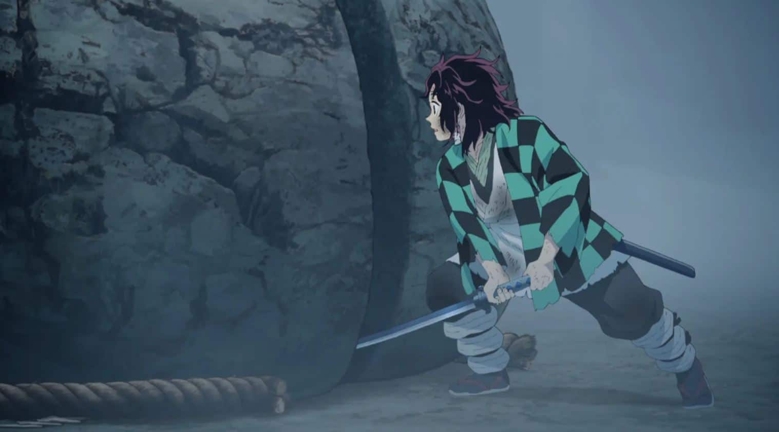 Este escena ocurre al final del episodio 3, donde después de un difícil entrenamiento, Tanjiro logra partir con su katana una roca grande.