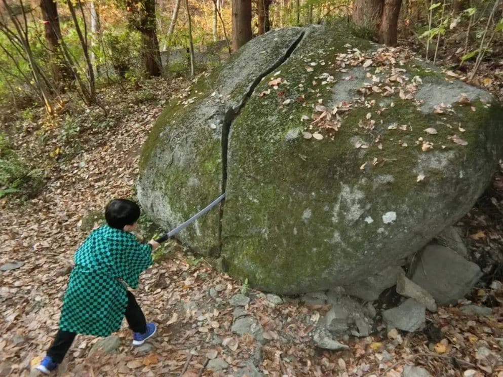 La imagen fue tomada en la ciudad de Suzaka, Prefectura de Nagano, y nos muestra un niño distraído de Tanjiro, con una katana en mano, recreando una escena donde el protagonista corta por la mitad una roca.