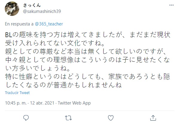 El número de personas que tienen gusto por el BL o Yaoi está aumentando, pero sigue siendo una cultura que no está aceptada actualmente. De hecho, no creo que pierda su dignidad como padre, pero hay mucha gente que no quiere que sus hijos vean este tipo de imagen ideal. Especialmente la sexualidad, aunque sea un miembro de la familia, podría querer ocultarla.