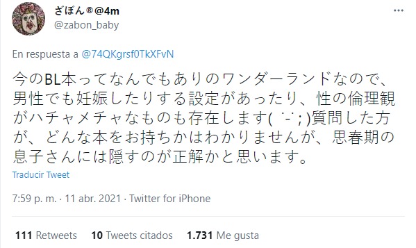 Los libros BL o Yaoi de hoy en día son una lugar misterioso lleno de cualquier cosa, algunos de ellos tienen escenarios en los que incluso los hombres pueden quedarse embarazados, y algunos de ellos tienen una ética sexual loca (˙-˙;). No sé qué tipo de libros tiene la madre que ocasionó la pregunta, pero creo que es correcto que lo ocultara de su hijo adolescente.