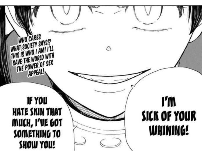 Curiosamente, el autor de Fire Force contesto a esta controversia en un panel de manga a través del personaje Tamaki Kotatsu, diciendo lo siguiente: «¿A quién le importa lo que diga la sociedad? ¡Esto es lo que soy! Voy a salvar el mundo con el poder del atractivo sexual. ¡Estoy harto de tus quejas! Si odias tanto la piel, tengo algo que enseñarte».