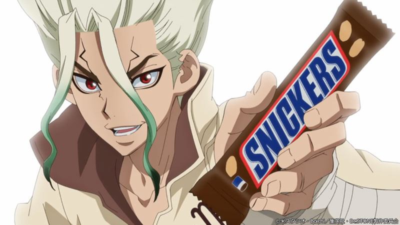 El canal oficial de youtube de Snickers Japón revelo un comercial en donde podemos ver que la empresa comenzó una colaboración con el anime Dr. Stone y el comediante Japones Kouki Kusanagi.