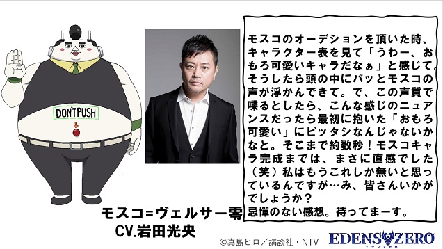 Mediante su cuenta de Twitter de la adaptación al anime del manga Edens Zero, se revelo que el seiyuu Mitsuo Iwata se unirá al elenco de voz del anime para interpretar al personaje Mosco Versa-0. El personaje aparecerá en el noveno episodio de la serie, el cual se estrenara el sábado. Actualmente la serie solo esta disponible de manera legal en Netflix, y llegará a otras regiones del mundo en el mes de octubre del 2021.