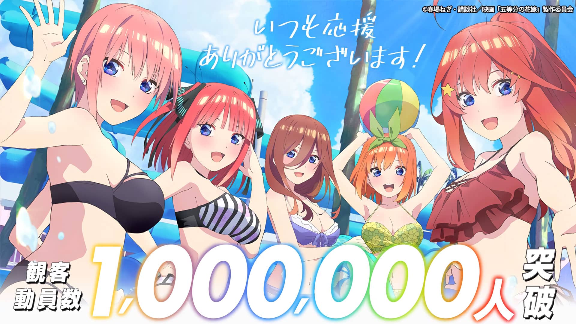 Según un reporte realizado en el Twitter oficial para la adaptación al anime del manga «Go-Toubun no Hanayome» (The Quintessential Quintuplets), se anunció que la película de la franquicia «Eiga Go-Toubun no Hanayome» logró superar el 1 millón de espectadores.
