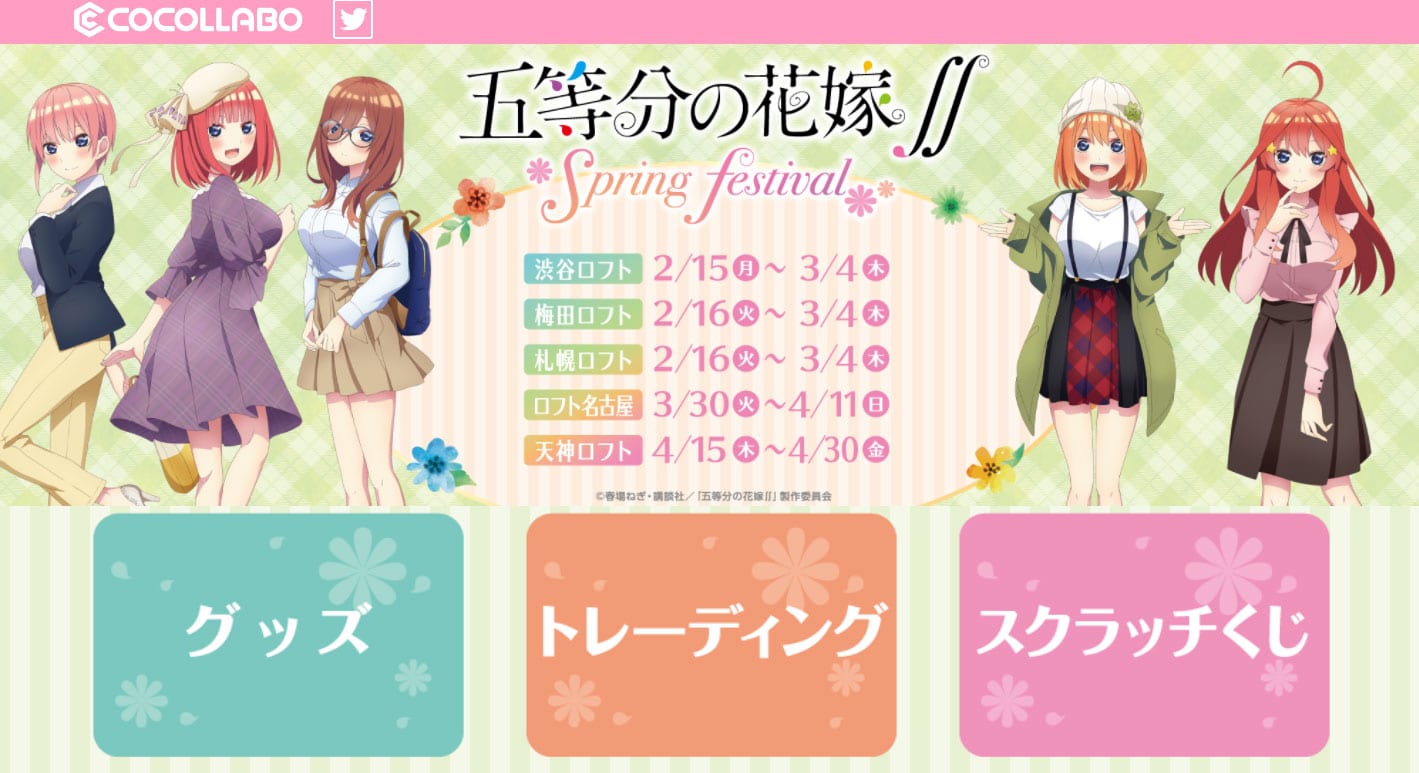 A través del sitio web oficial de la compañía COCOLLABO, se anuncio que realizará una colaboración con la franquicia de Go-Toubun no Hanayome (The Quintessential Quintuplets), en el que se presentaran productos especiales de edición limitada. Estos productos estarán disponibles a través de una tienda temporal que abrirá el próximo 15 de febrero.