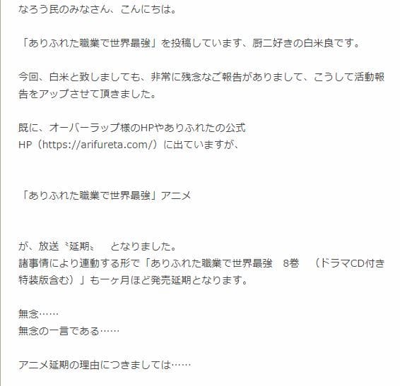 Incluso el autor en su publicación se disculpó con los fans por todo el apoyo que recibió para que al final la adaptación anime los defraude. Al final, expresó su esperanza de que el retraso daría el tiempo suficiente para que el anime pudiera mejorar.