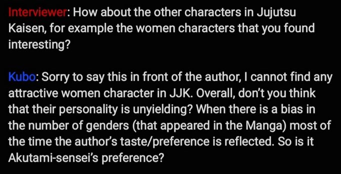 En esta se puede leer la frase exacta que es » 久保 本人 を 前 に 申し訳 ない の だ けど 、 『 呪術 廻 戦 』 の 女性 キャラ に 好み の 子 が い ない ん だ よ ね 。 全体 的 に 性格 キツ くない ? 異性 の キャラクター が 偏っ てる 時 って 、 作 者 の 好み が 反映 さ れ て いる 事 が 多い ん だ けど 、 芥見 先生 の 好み な の か な って 。» (Siento ser yo quien te diga esto, pero no me interesa ninguno de los personajes femeninos de Jujutsu Kaisen. ¿No son sus personalidades generalmente demasiado duras? Cuando hay un sesgo hacia los personajes del sexo opuesto, suele ser un reflejo del gusto del autor, pero me pregunto si es la preferencia de Akutami-sensei.)